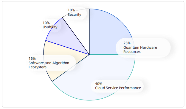 A total of 10 representative quantum computing cloud platforms were selected for assessment, including IBM Quantum Experience, Amazon Braket, Google Quantum AI, Microsoft Azure Quantum, D-Wave Leap, Xanadu Cloud, IQM Resonance, Quandela Cloud, Origin Quantum Cloud, and QuantumCTek Cloud. The evaluation covers five core dimensions with weighted scores: Quantum Hardware Resources (25%), Cloud Service Performance (40%), Software and Algorithm Ecosystem (15%), Usability (10%), and Security (10%).