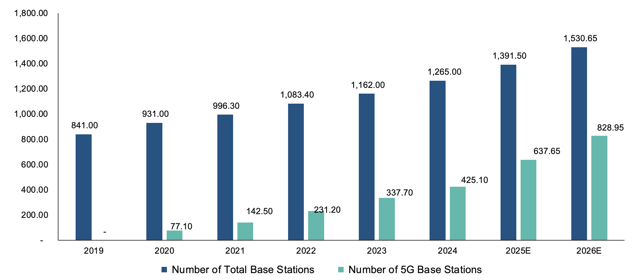 According to the 2024 Communication Industry Statistical Communique released by MIIT, as of the end of 2024, the total number of mobile communication base stations nationwide reached 12.65 million, a net increase of 1.026 million compared with the end of the previous year. Among them, there were 7.112 million 4G base stations, a net increase of 818,000; and 4.251 million 5G base stations, a net increase of 874,000. 5G base stations accounted for 33.6% of the total number of mobile communication base stations, an increase of 4.5 percentage points from the end of the previous year. It is expected that by 2026, the number of China's mobile communication base stations will reach 15.3065 million, including 8.2895 million 5G base stations (a net increase of 1.3915 million from the previous year), accounting for 54.15% of the total base stations.