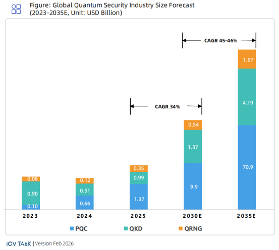 In 2025, the global quantum security industry size is approximately $2.703 billion, with a projected surge to $11.805 billion by 2030, representing a Compound Annual Growth Rate (CAGR) of roughly 34% for the 2025–2030 period. As the synergistic application of PQC and QKD establishes a stable deployment model, the industry is poised for accelerated growth after 2030. It is estimated that the industry size will reach approximately $76.795 billion by 2035, with the CAGR for the 2030–2035 period climbing to 45%–46%.