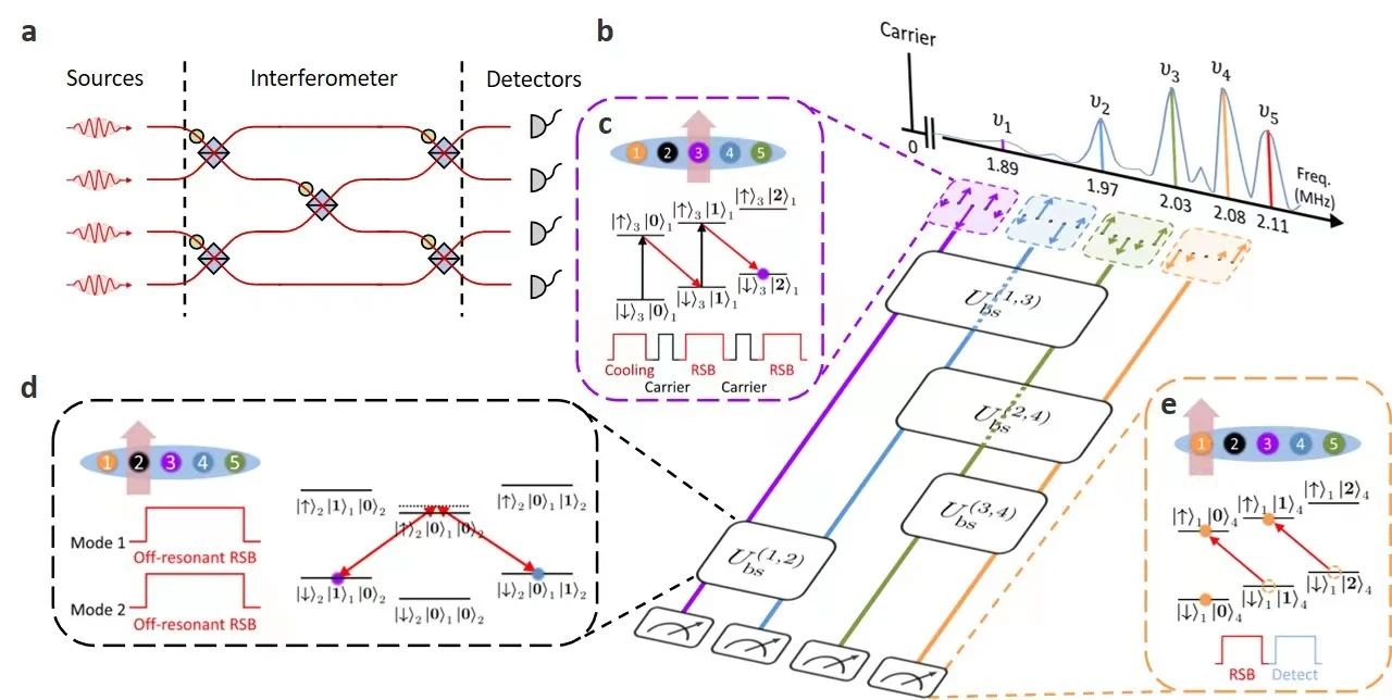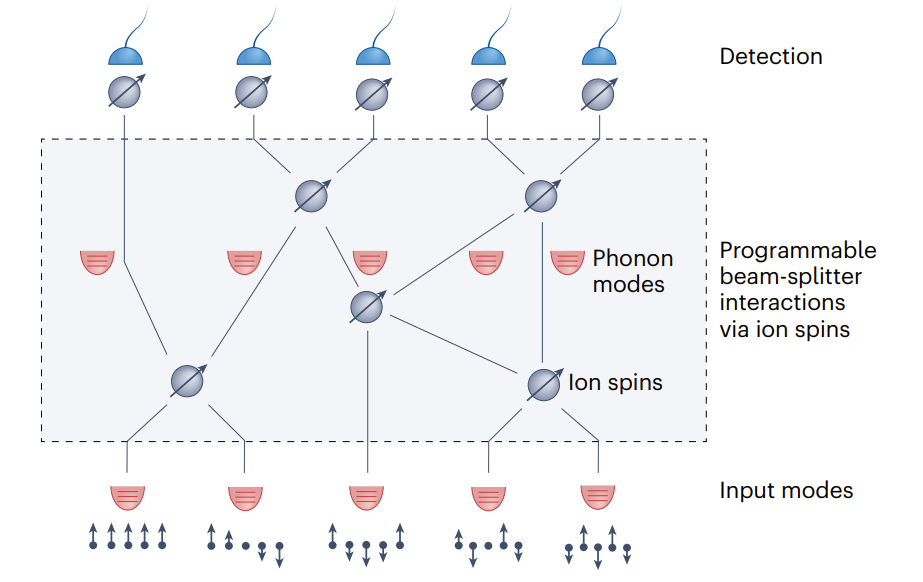 One such application is the boson sampling problem. The goal is to predict the output probability of a network of interacting boson modes - a formidable mathematical computational task. In this work by the Tsinghua ion trap team, phonons take the place of photons and act as beam splitters by interacting with the internal ion states.