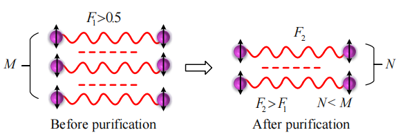 As shown in the figure, before entanglement purification, there are M copies of non-maximally entangled states with fidelity F1. During entanglement purification, these entangled quantum bit pairs are processed to produce fewer and less noisy copies. Therefore, after entanglement purification, N pairs of entangled quantum bit pairs with fidelity F2 are generated from the original M non-maximally entangled quantum bit pairs, i.e., N < M and F1 < F2.